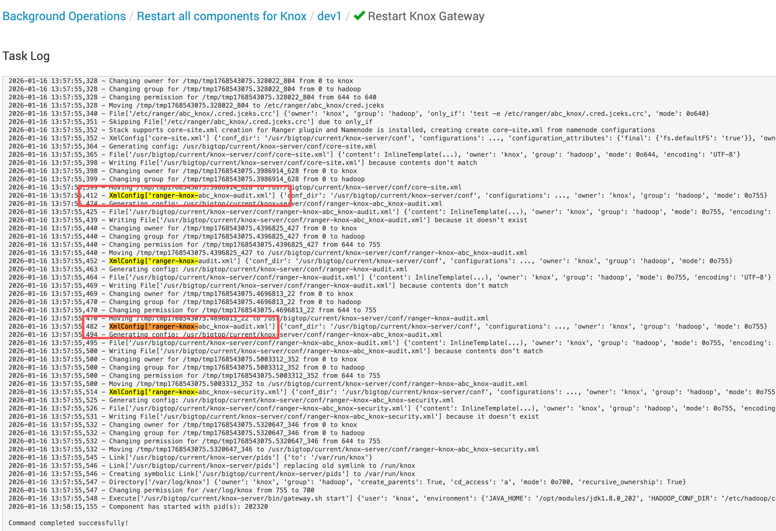 params.repo_name:Ranger 插件 repo(如abc_knox)对应的命名维度conf_dir=params.knox_conf_dir:落盘目录(通常对应 Knox conf 目录或插件期望目录)owner/group/mode:直接决定 Knox 运行时是否能读取(生成成功后建议顺手核一下属主属组)