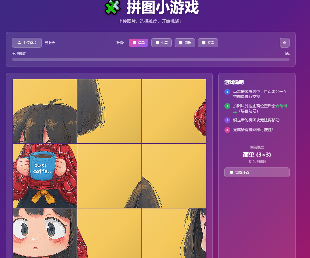 puzzle-game/ ├── index.html # 主页面文件 ├── confetti.browser.min.js # 庆祝特效库 └── (可选) assets/ # 静态资源目录🎯 使用指南