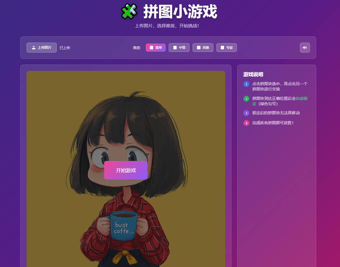 拼图小游戏是一个基于现代Web技术(HTML5、CSS3、JavaScript)开发的交互式拼图游戏,支持自定义图片上传、多难度级别选择、音效系统和庆祝特效。