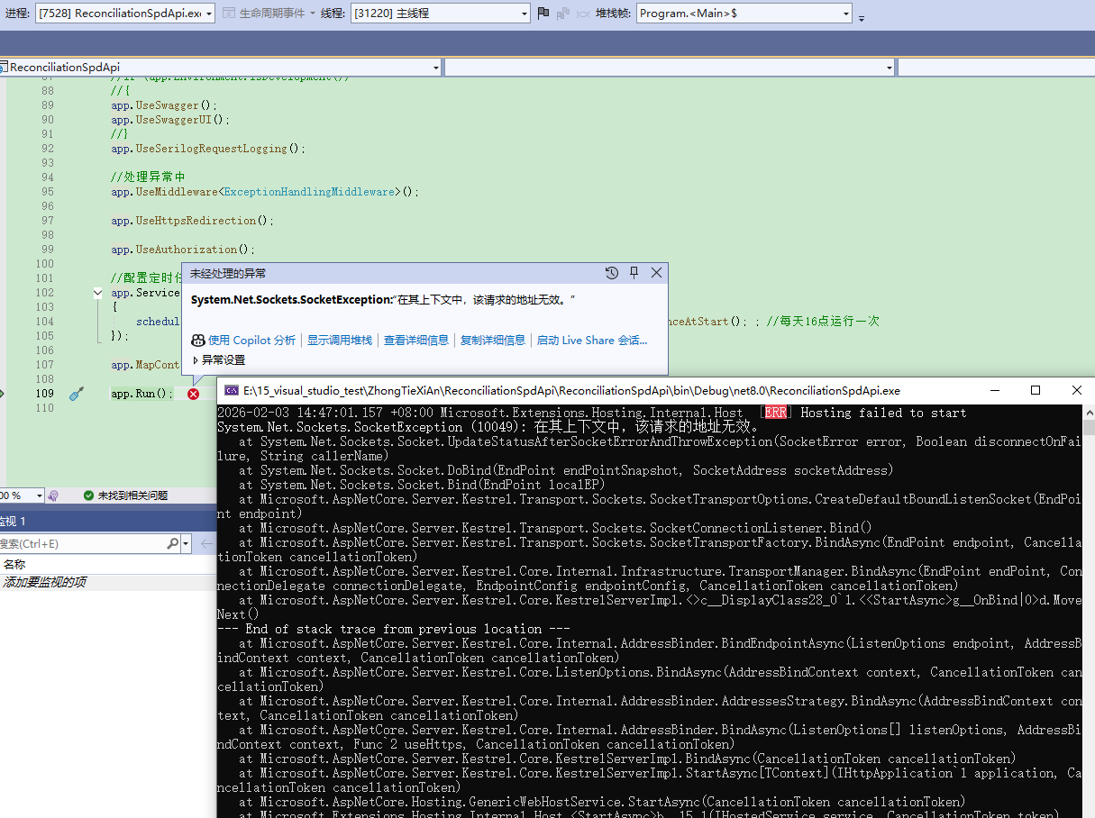 报错的原因是:Kestrel在启动时无法绑定到指定的网络地址