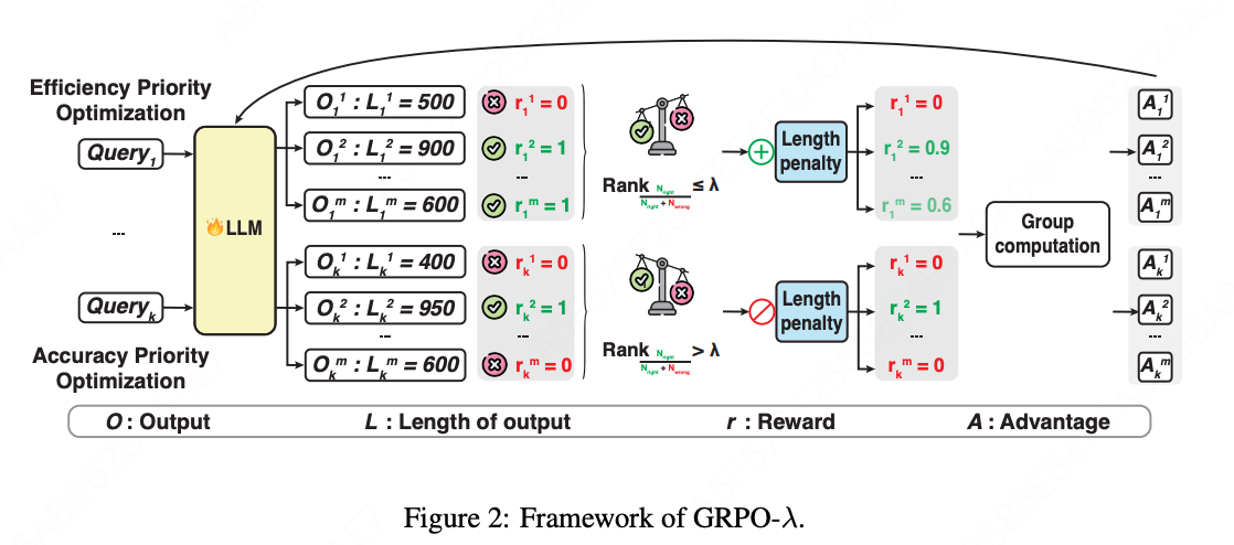 对每个训练查询 Q k Q_k Qk,模型生成 m m m 个候选回答 { O k 1 , O k 2 , ... , O k m } \{O_k^1, O_k^2, \ldots, O_k^m\} {Ok1,Ok2,...,Okm}。每个 O k i O_k^i Oki 包含:长度 L k i L_k^i Lki 和 结果奖励 r k i ∈ { 0 , 1 } r_k^i \in \{0, 1\} rki∈{0,1}