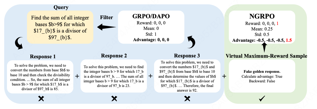 核心思想:引入虚拟最大奖励样本,改变群体内奖励的均值和方差,从而为同质化错误样本赋予非零优势,使模型能够从失败中学习并增强探索能力。