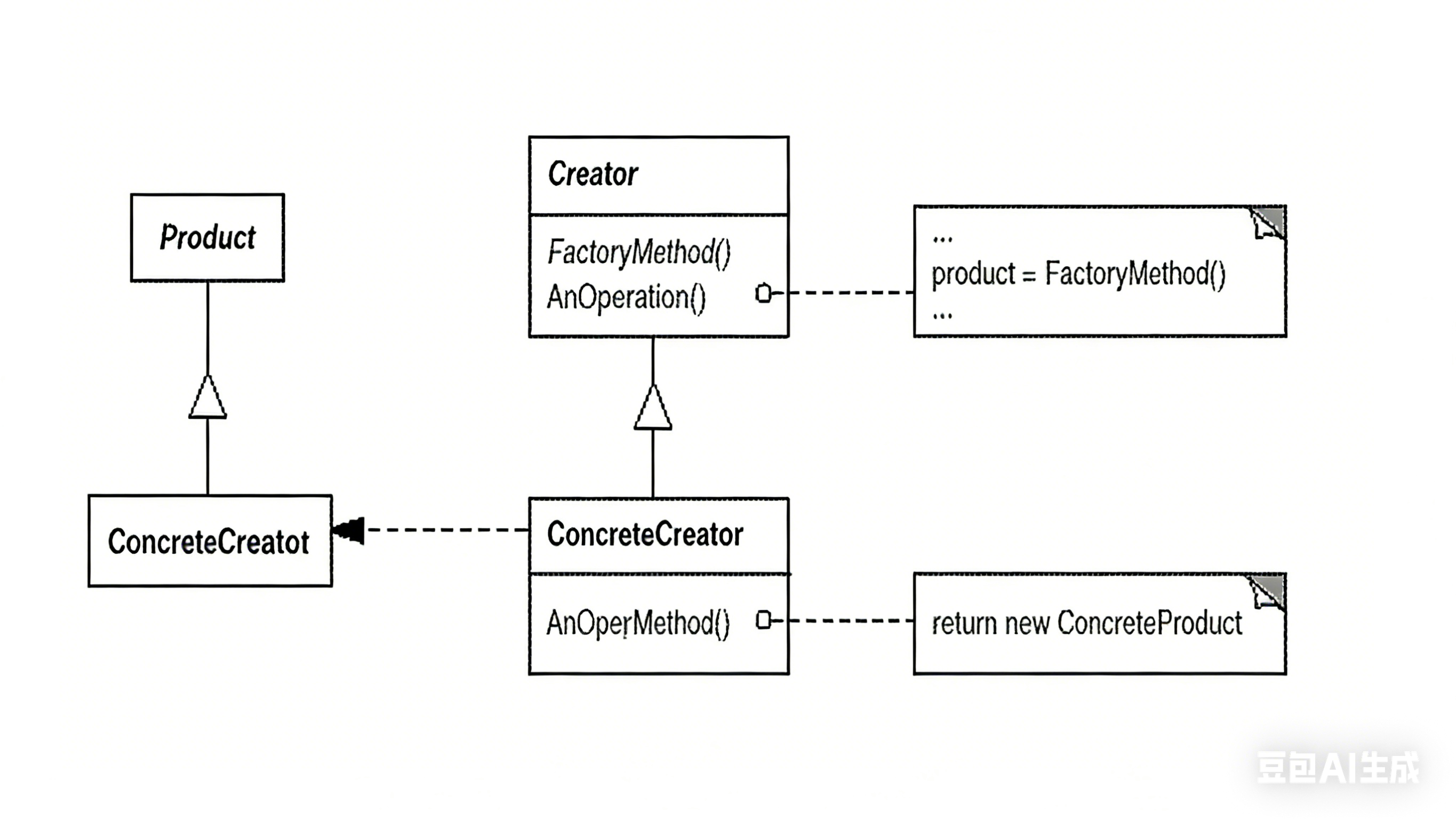 致软件脆弱。 - Factory Method模式通过面向对象的手法,将所要创建的具体对象工作延迟到子类,从而实现一种扩展(而非更改)的策略,较好地解决了这种紧耦合关系。