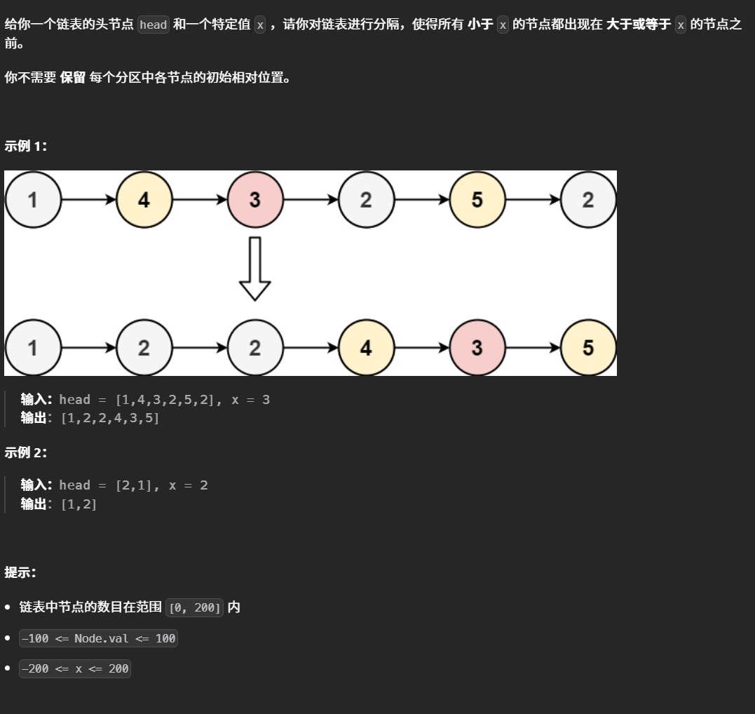 创建两个新链表,list1和list2分别存放小于x和大于或等于x的节点,最后让list1的尾指针指向list2的第一个元素即可。