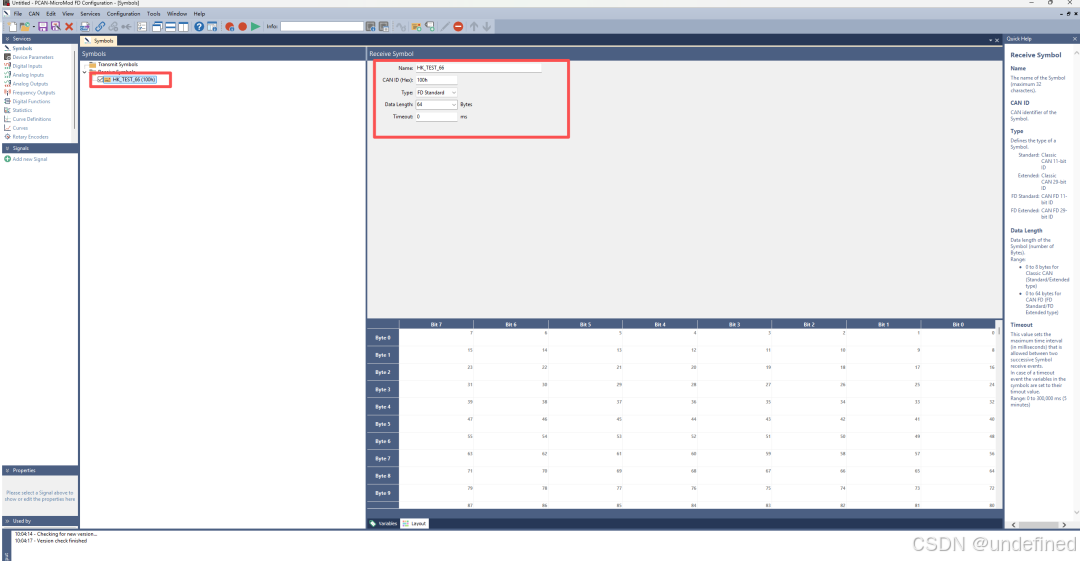 在Services栏目下,选择Symbols,在新窗口的Receive Symbols处点击鼠标右键(发送区操作相同),可配置接收的报文:设置报文名、报文ID、选择报文类型、设定报文数据长度,超时时间一般设为0ms,可根据实际需求调整。