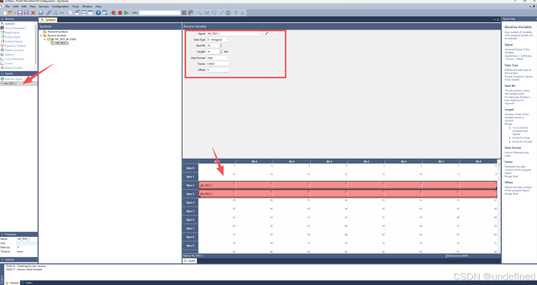 新建的信号会出现在Symbols栏目中,点击该信号可进一步配置:数据类型(无符号 / 有符号 / 浮点数等)、开始比特位、数据长度(占多少位)、数据格式(如 Intel)、乘数和偏移等参数。