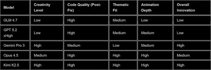 像 GPT 和 GLM 这样的主流模型在可靠性方面表现出色,但在才华方面表现不佳。像 Kimi 和 Gemini 这样的利基模型尝试了开箱即用的方法。所有模型都很好地处理基于 Tailwind 的代码,但自定义组件(如 Kimi 的拨盘)需要更多的开发输入。