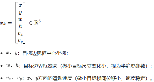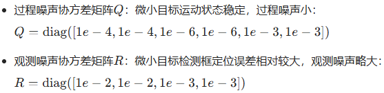 - 观测噪声R:位置观测噪声(1e-2)大于宽高观测噪声(1e-3),因微小目标位置检测误差相对更大;