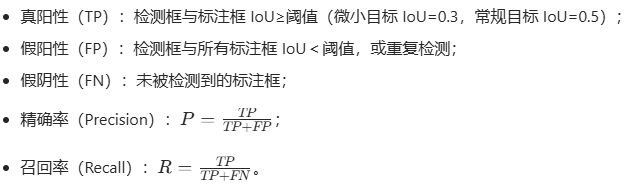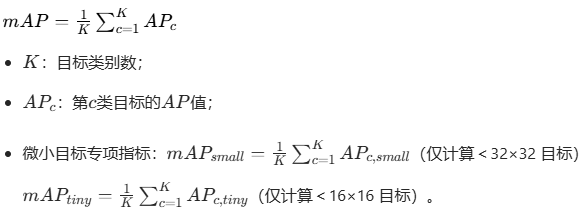 mAP 是目标检测的核心精度指标,针对微小目标场景,重点计算APsmall(<32×32)与APtiny(<16×16)。