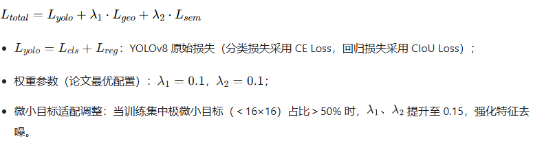 DN-FPN 的对比损失作为辅助损失,与 YOLOv8 的原始损失(分类损失Lcls+ 回归损失Lreg)加权融合,总训练损失为: