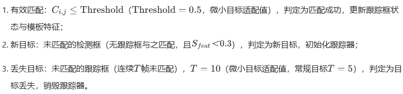 - 匈牙利算法代价矩阵权重α=0.3、匹配阈值 = 0.5,侧重特征相似度,提升微小目标关联鲁棒性;