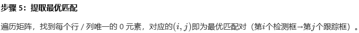 假设M≤N(检测框数量≤跟踪框数量),算法目标是为每个检测框分配唯一跟踪框,使总代价最小,步骤如下: