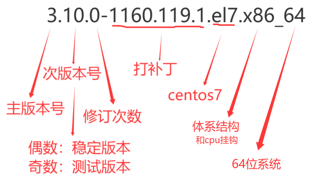 认识linux内核版本名称,以3.10.0-1160.119.1.el7.x86_64为例: