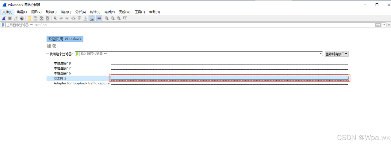 1.wireshark可以自动识别出电脑上面的网卡(包括虚拟网卡),双击需要抓包的网卡。