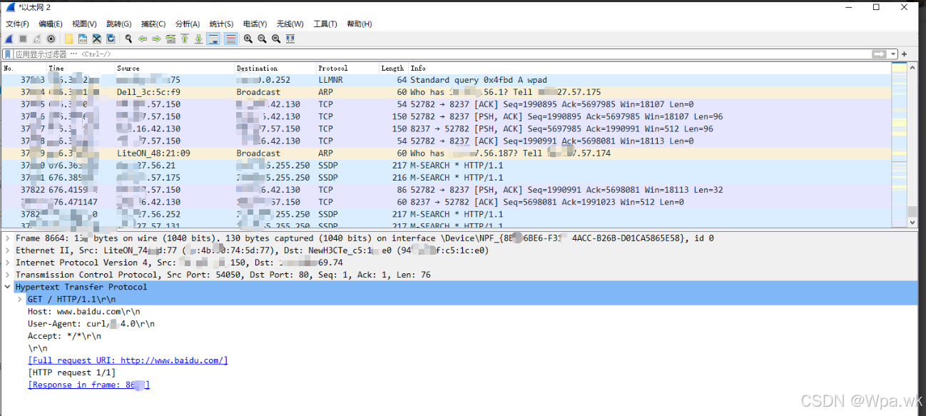 - 双击进入此界面后,Wireshark已经自动开始了抓包过程,如果网卡在与其他网络设备通讯,就能看到各种网络协议报文.
