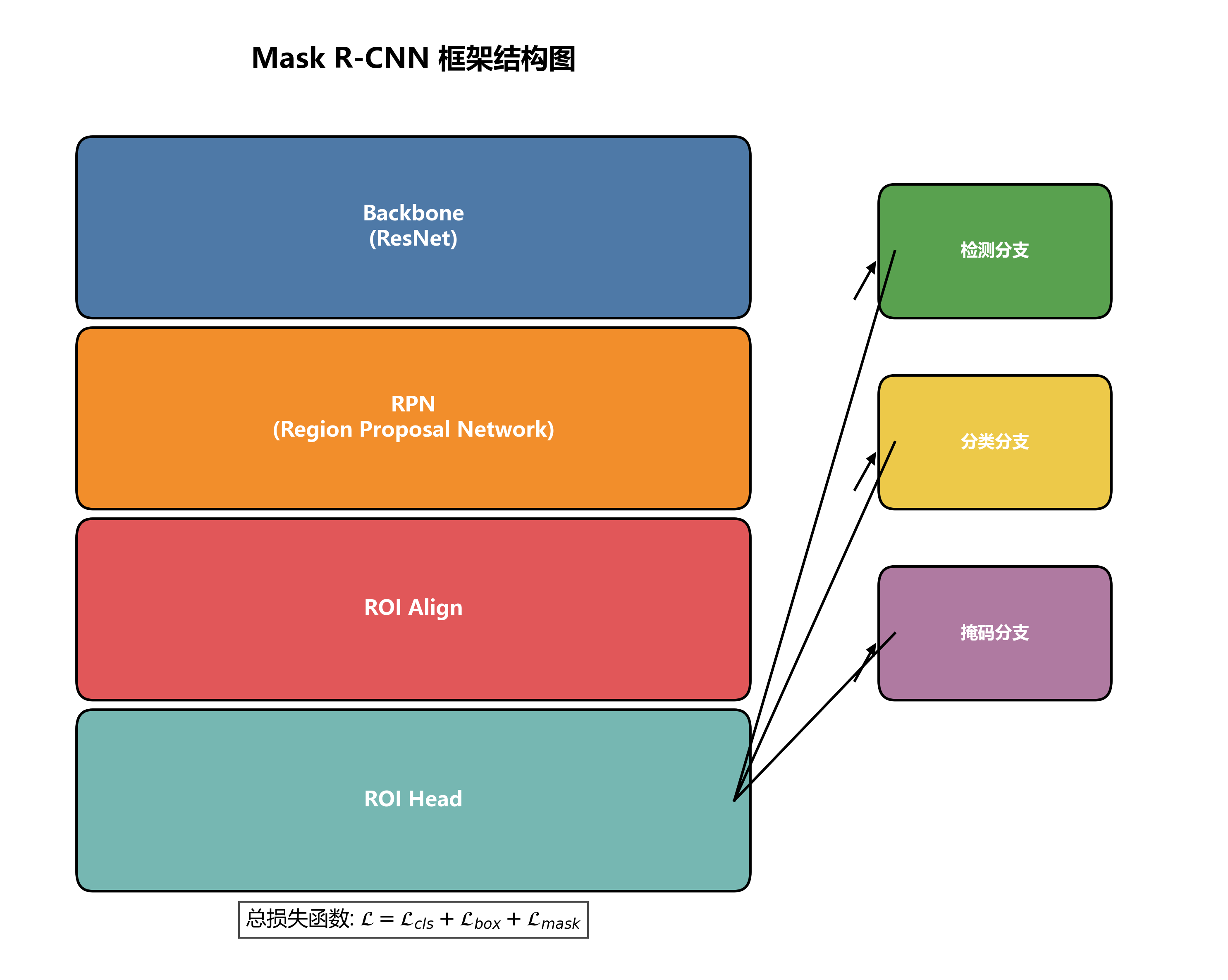 Mask R-CNN的创新之处在于它将目标检测、实例分类和像素级实例分割三个任务统一到一个框架中,实现了端到端的训练。其数学表达式可以表示为: