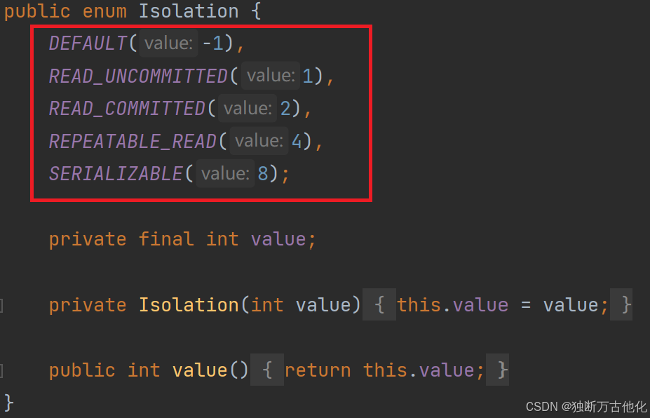 - Isolation.DEFAULT :以连接数据库的事务隔离级别为主(默认值),例如 MySQL 对应