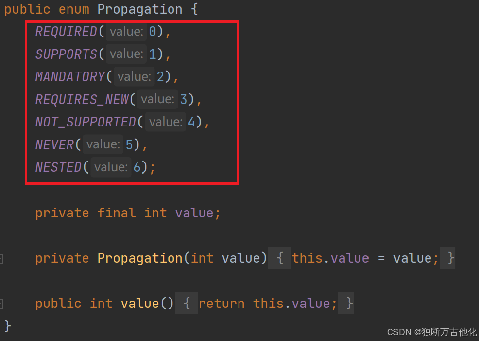 Spring 事务传播机制通过 @Transactional 注解的 propagation 属性指定,共 7 种,对应 Propagation 枚举: