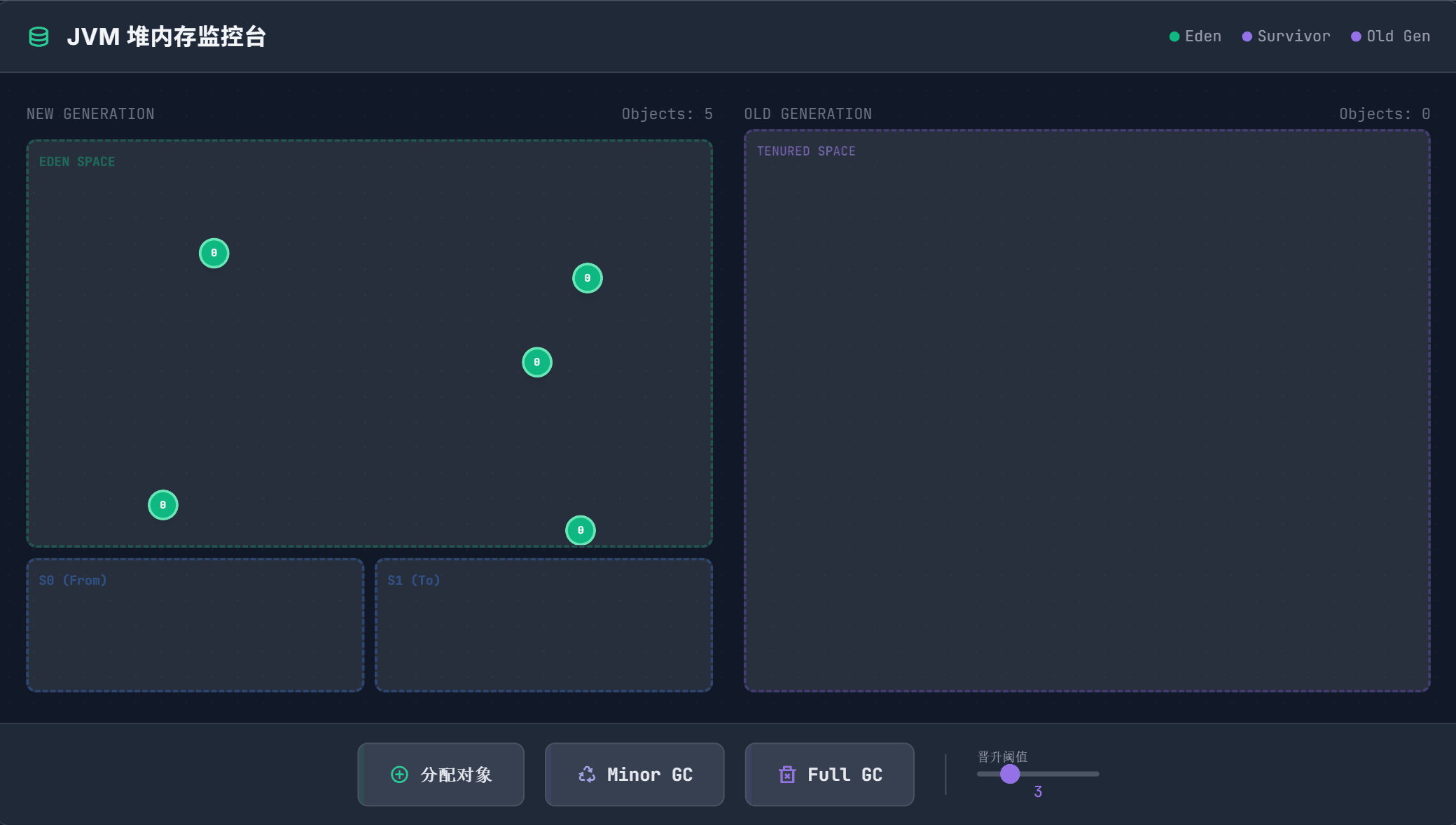 - 新生代 :绝大多数新创建的对象首先在这里分配内存。新生代内部又分为一个Eden区 和两个Survivor区(From和To)。新对象在Eden区分配。当Eden区没有足够空间进行分配时,将触发一次Minor GC。