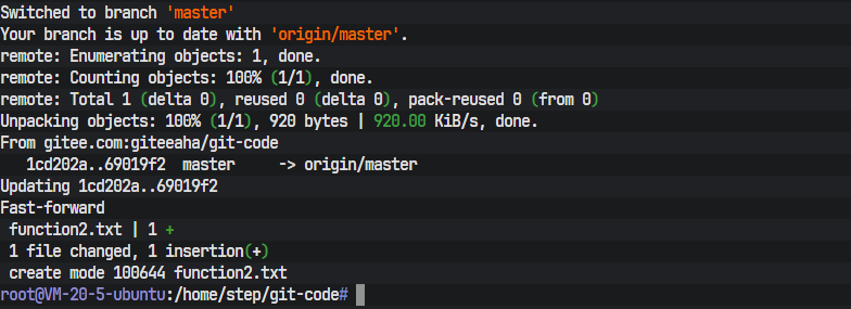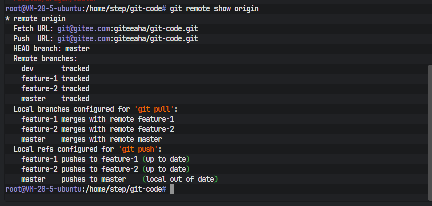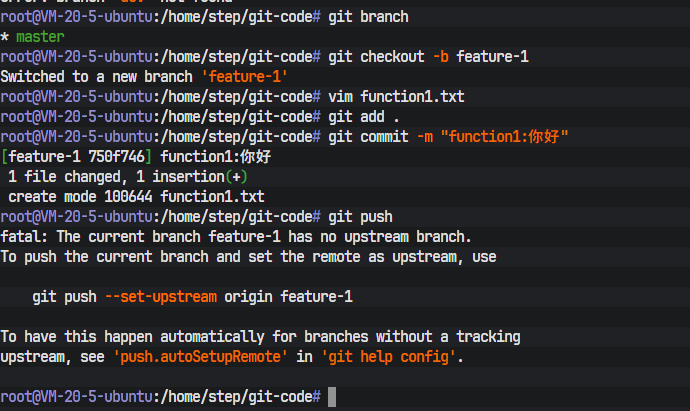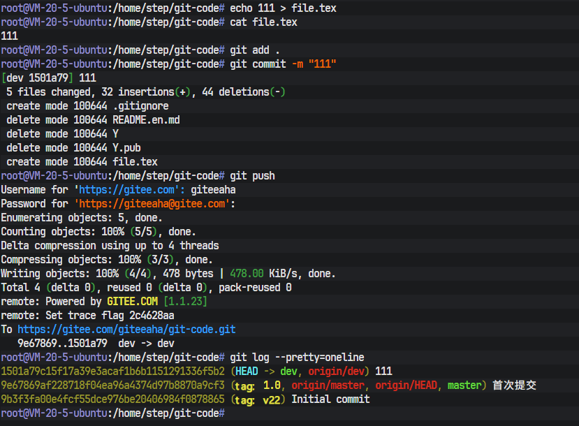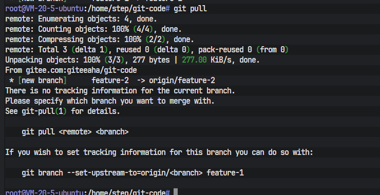 一个配置妥当的终端环境是所有操作的起点。终端的命令提示符root@VM-20-5-ubuntu:/home/step/git-code#清晰地揭示了当前的操作环境信息:操作用户为root,主机名为VM-20-5-ubuntu,当前所在的工作目录是/home/step/git-code。这个git-code目录即为本次实践操作的本地Git仓库。