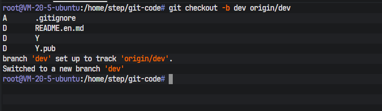命令执行后,终端给出了清晰的反馈信息。第一行Branch 'dev' set up to track remote branch 'dev' from 'origin'.,确认了跟踪关系已成功建立。这层关系意味着将来在这个本地dev分支上执行git pull或git push时,Git会自动知道要与origin/dev进行交互,无需再手动指定。第二行Switched to a new branch 'dev',表明当前工作区已经切换到了新创建的dev分支。至此,开发者1的本地环境已完全准备就绪。