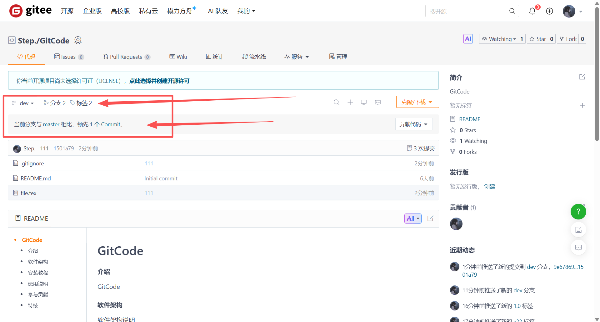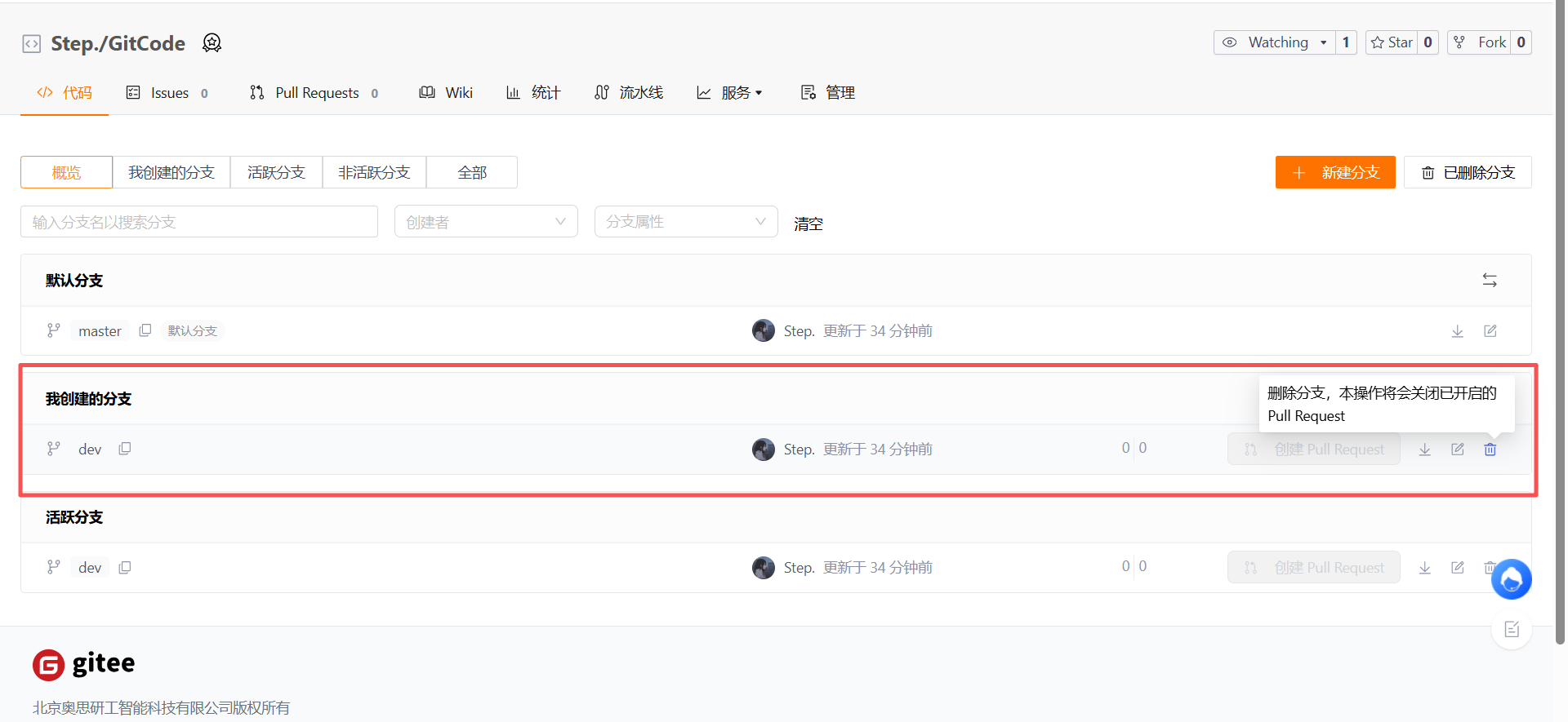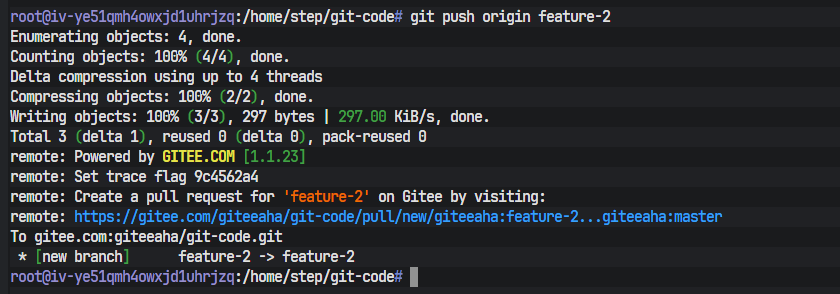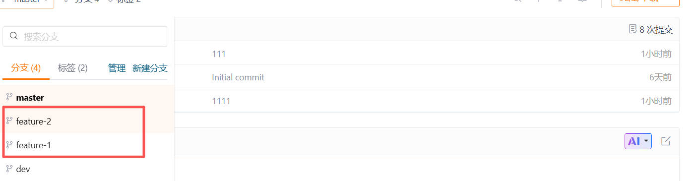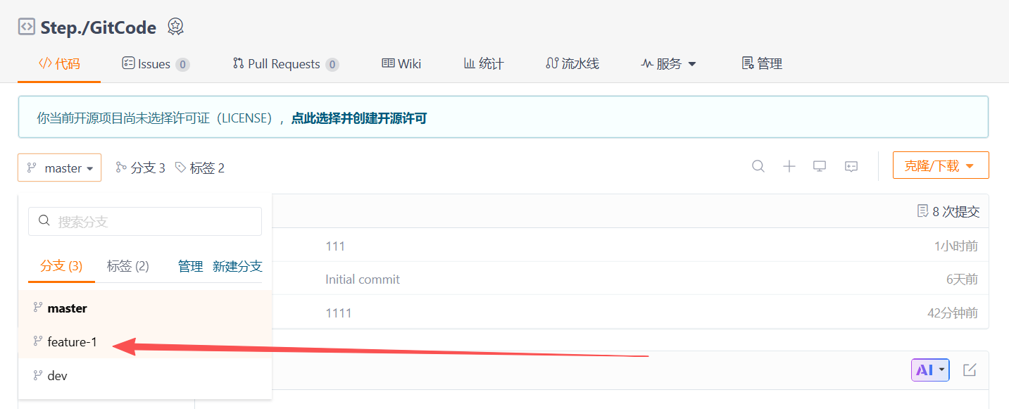 推送成功后,刷新Gitee的远程仓库页面,可以看到feature-1分支已经出现在分支列表中,这表明开发者1的工作已经成功推送到远程,可供团队其他成员查看或协作。