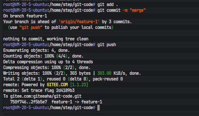 合并完成后,开发者1需要将这个更新后的feature-1分支(它现在既包含了功能1,也包含了功能2)推送到远程。