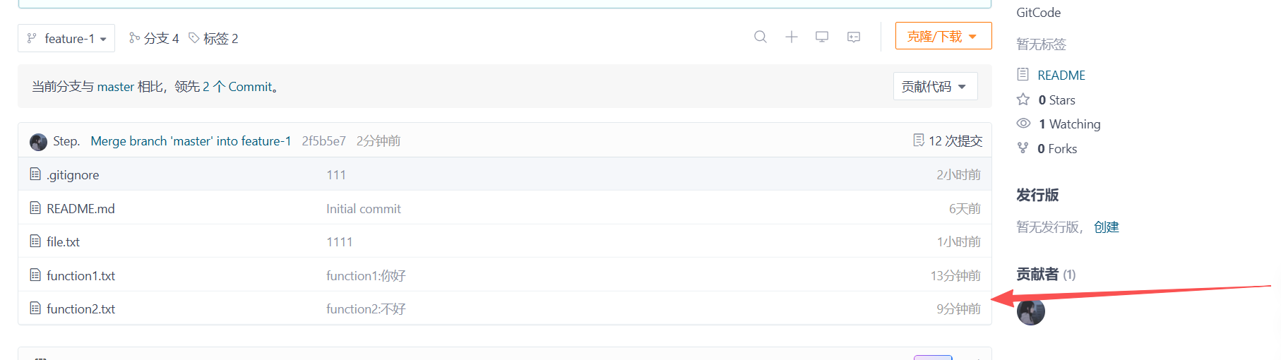 在feature-2分支上,他创建了function2.txt文件并提交了变更。