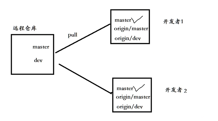 现在假设一个场景:开发者1在项目负责人创建远程dev分支之前,就已经通过git clone命令克隆了仓库。这意味着,开发者1的本地Git仓库中,只记录了克隆时远程仓库的状态,对于新创建的dev分支一无所知。为了能够参与到dev分支的协作中,开发者1必须先更新本地仓库信息,使其"感知"到这个新分支的存在。