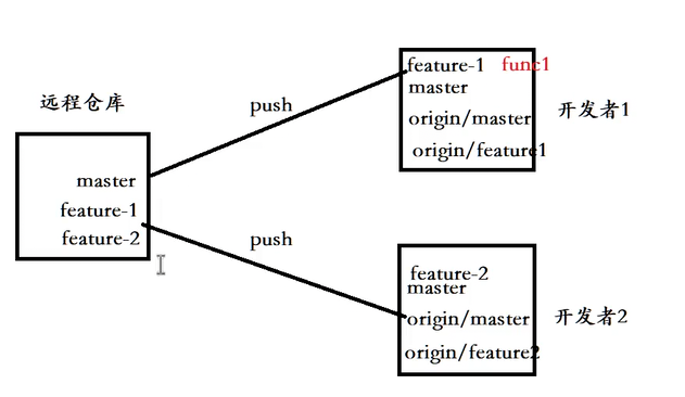 最后,他也像开发者1一样,首次推送feature-2分支时,将其推送到远程仓库并建立跟踪关系。此时,远程仓库中同时存在master、feature-1和feature-2三个分支,两位开发者的工作在各自的分支里独立演进。