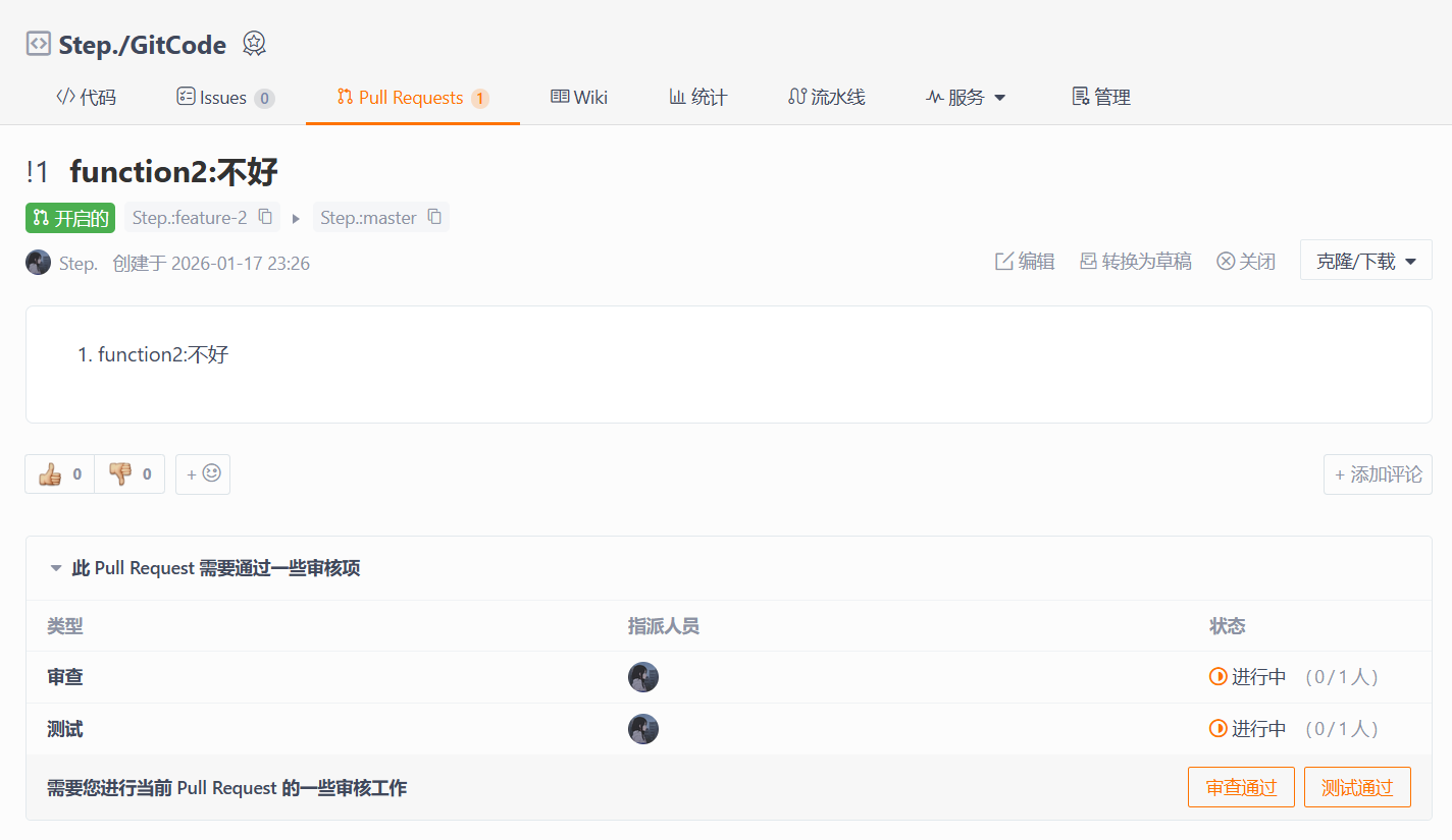 项目负责人审核后,合并了这个PR。至此,function1.txt和function2.txt两个功能都已成功、安全地集成到了主干master分支中。