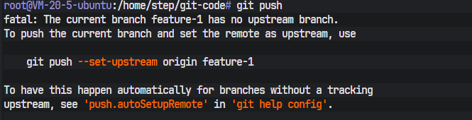 Git返回了一个fatal错误:The current branch feature-1 has no upstream branch.。这个错误的原因是,feature-1是开发者1在本地创建的,远程仓库origin对此一无所知。当执行git push时,Git不知道应该将这个本地分支推送到远程的哪个分支上。Git的提示信息非常友好,直接给出了解决方案:git push --set-upstream origin feature-1。