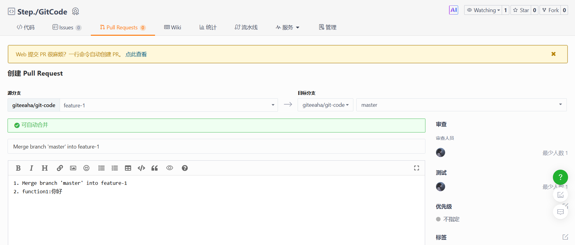 最佳实践:在为一个功能分支创建PR之前,特别是当主干分支在你开发期间已经有了更新时,应当先将最新的主干分支合并到你的功能分支中。这个过程被称为"与主干同步",其目的是提前在本地解决可能存在的冲突,确保你的PR能够被干净利落地合并。