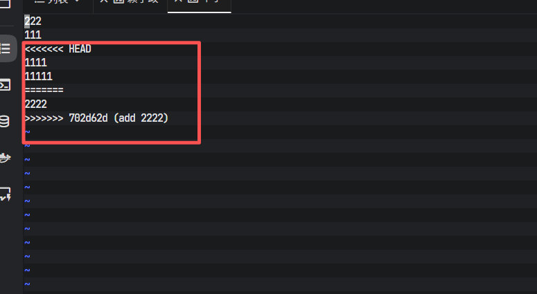 <<<<<<< HEAD: 这部分标记的开始,HEAD代表当前本地分支的最新提交。从这里到=======之间的内容,是开发者2自己的修改,即"222"。=======: 这是本地修改与远程修改的分隔线。>>>>>>> ...: 从=======到这个标记之间的内容,是从远程拉取下来并导致冲突的变更,即开发者1添加的"111"。