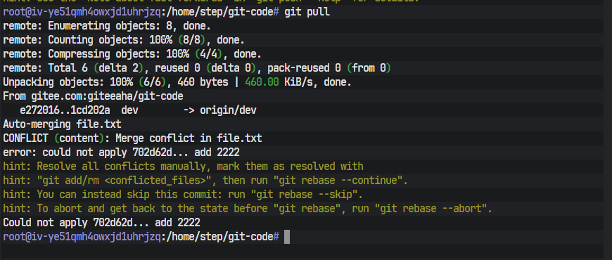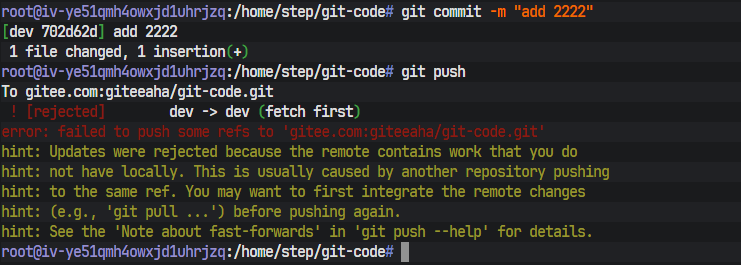 ! [rejected] dev -> dev (non-fast-forward): 推送被拒绝。error: failed to push some refs to '...': 推送失败。hint: updates were rejected because the remote contains work that you do not have locally.:这句提示一针见血地指出了问题根源:远程dev分支上包含了你本地所没有的提交(即开发者1添加"111"的那个提交)。
