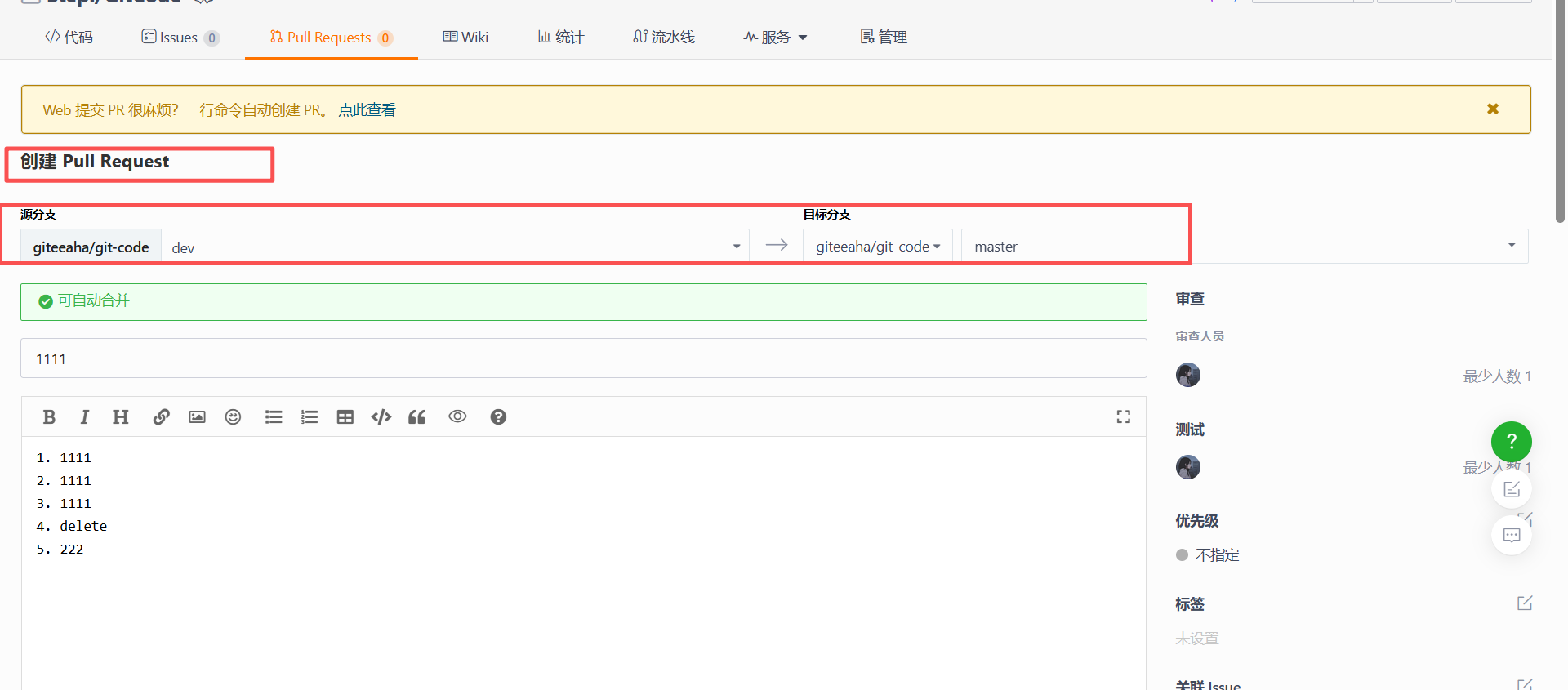 现代化的代码托管平台都提供了Pull Request(或称Merge Request)功能。开发者可以在Gitee的界面上发起一个新的PR,选择源分支为dev,目标分支为master。PR不仅是一个合并代码的请求,更是一个代码审查(Code Review)的平台。团队其他成员可以在PR中对代码进行评论、提出修改建议。这种机制是保障主干代码质量、促进知识共享的关键流程。
