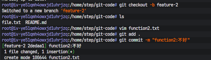 git checkout -b feature-1: 从当前分支(假设是master)创建新分支feature-1并立即切换过去。echo "this is function1" > function1.txt: 创建function1.txt文件并写入内容。git add .和git commit -m "add function1": 暂存并提交变更。
