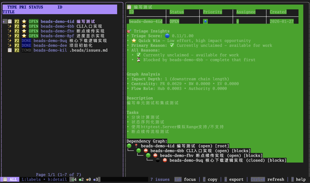 使用beads_viewer查看beads中的issue列表和状态: