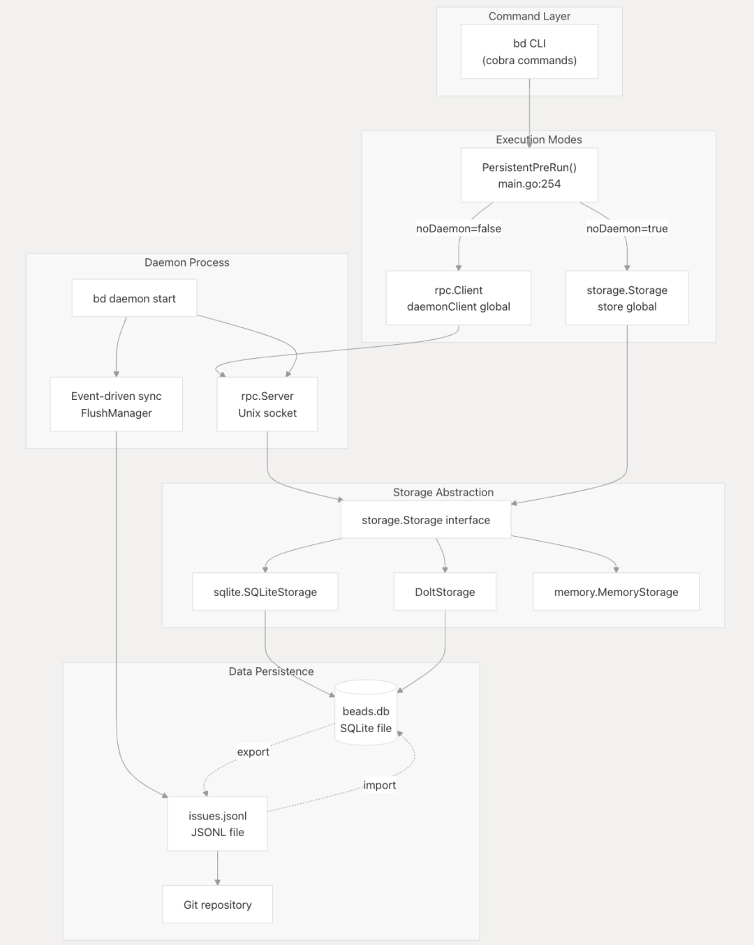 防抖刷新 (Debounced Flush):为了避免频繁的磁盘 I/O 和 Git 操作,Beads 实现了一个基于 Go Channel 的事件驱动 FlushManager。所有 flush 状态(isDirty、needsFullExport、debounceTimer)由单个后台 goroutine 拥有,通过 channel 通信消除了竞态条件。