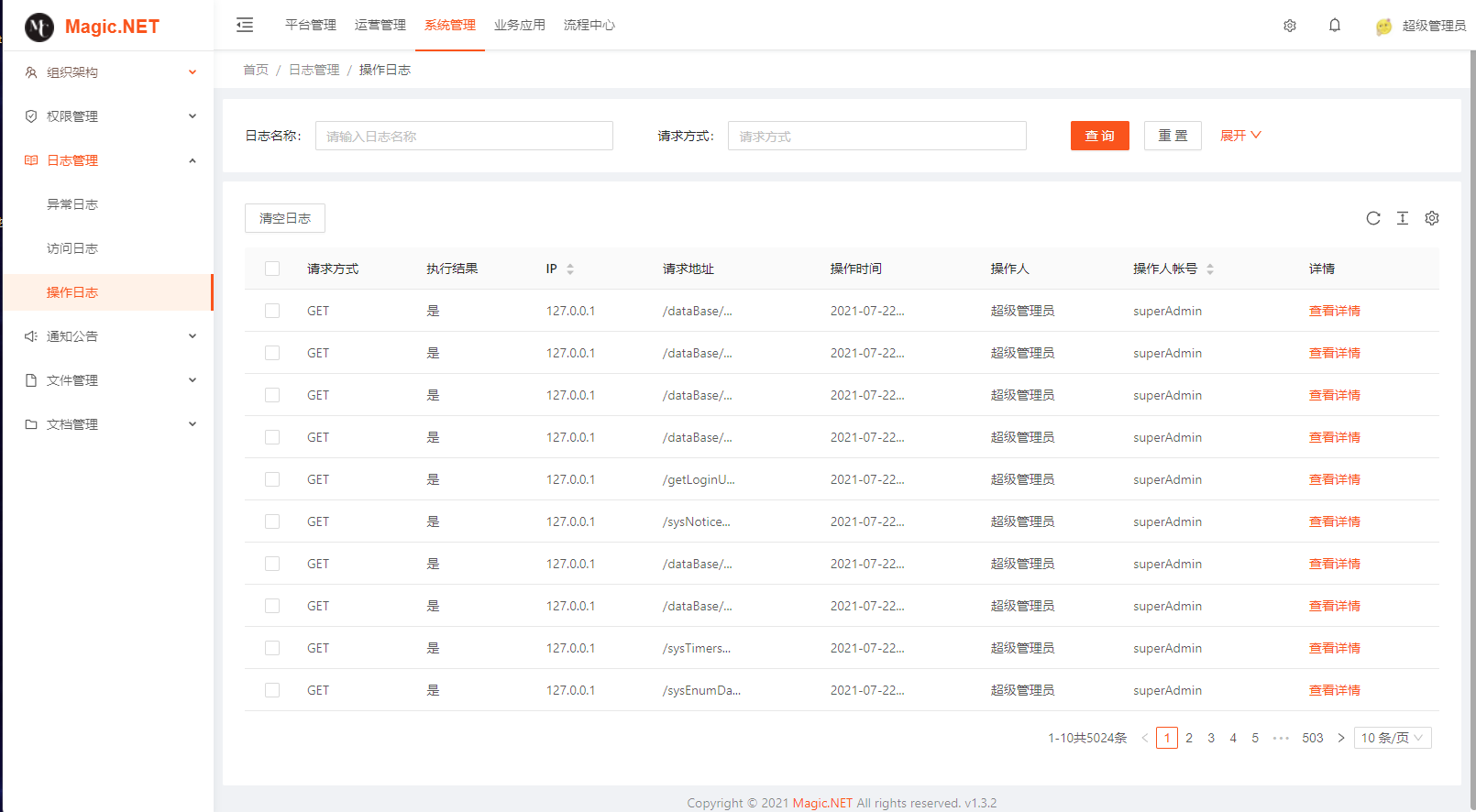 操作日志:用户的操作业务的日志的查看和管理。
