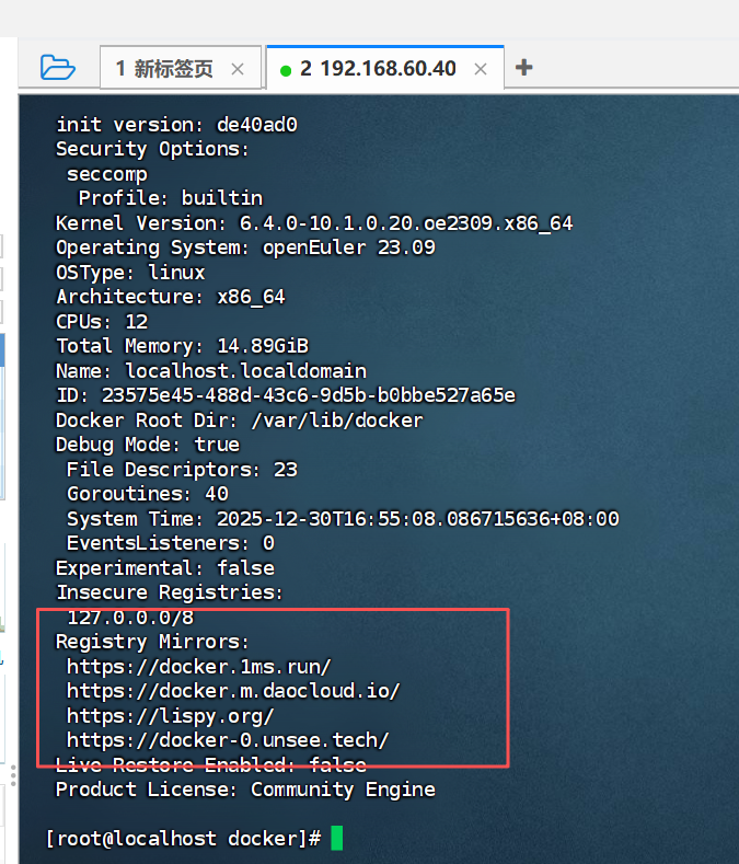 在输出结果中,找到 Registry Mirrors 字段,若显示刚才配置的镜像地址,则说明配置成功: