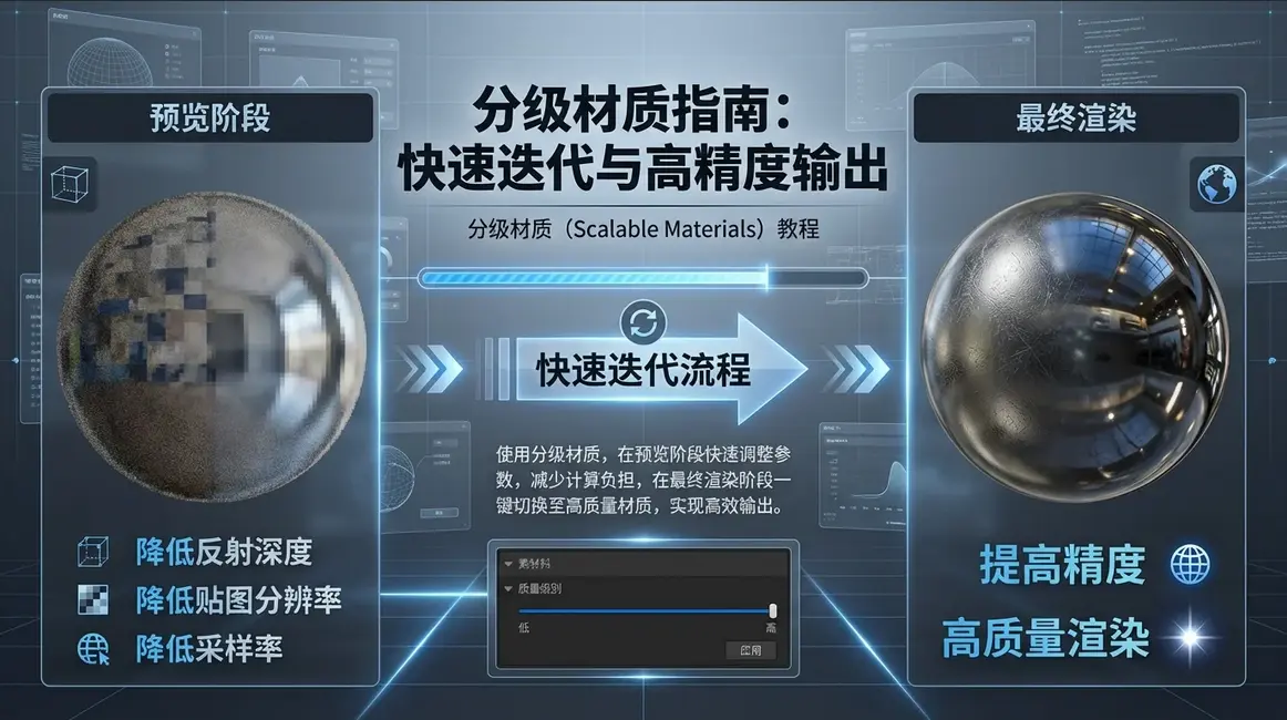 制作材质时,设置不同阶段的复杂度:预览阶段 :降低反射深度、贴图分辨率、采样率;最终渲染:再提高至合适的精度。这样可以在早期快速迭代,之后才用高质量渲染。