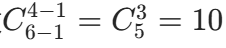 - 问题:将 6 个相同小球分给 4 个盒子,每个盒子至少 1 个,方案数是多少?