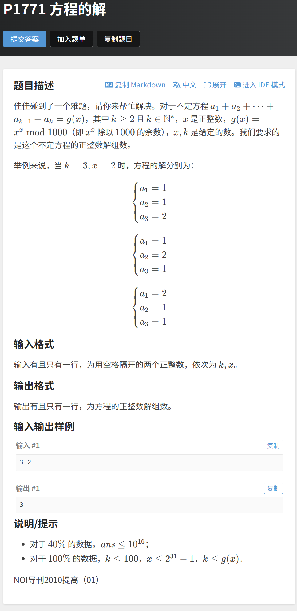 二、真题实战:洛谷 P1771 方程的解(隔板法 + 高精度)