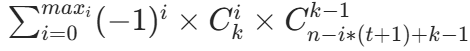 问题描述:有 n 个相同元素,分给 k 个不同盒子,每个盒子最多放 t 个元素,求方案数。