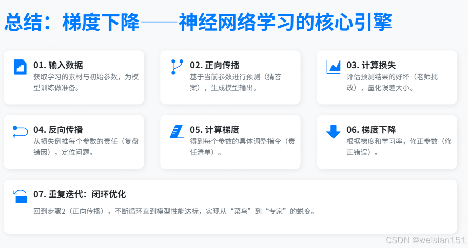 | 6 | 梯度下降 | 微调这些权重和偏置,相当于悄悄修正孩子的"直觉"和"习惯" |