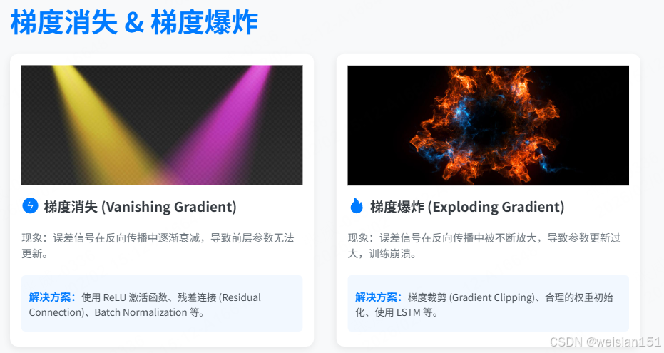 现象:与消失相反,某些层的梯度在反向传播中被不断放大,变得极大(如 10⁶、10⁹),导致参数更新一步跨出合理范围。