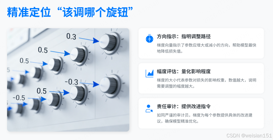 🌟 梯度告诉我们:进步不需要一步登天,只需要每一次都朝着"减少错误"的方向,轻轻转动那个属于你的旋钮。