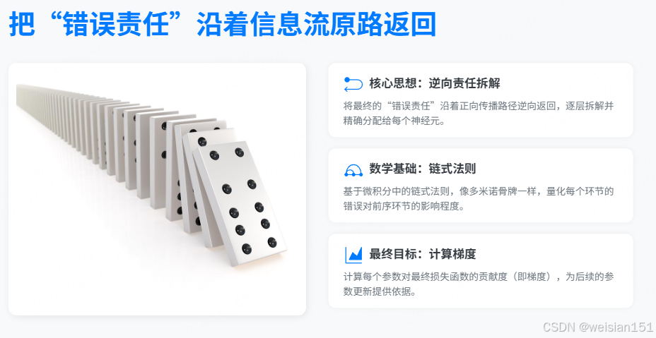 在这个过程中,每个神经元都会收到一个"责任分数"------这就是损失对它的参数的梯度。