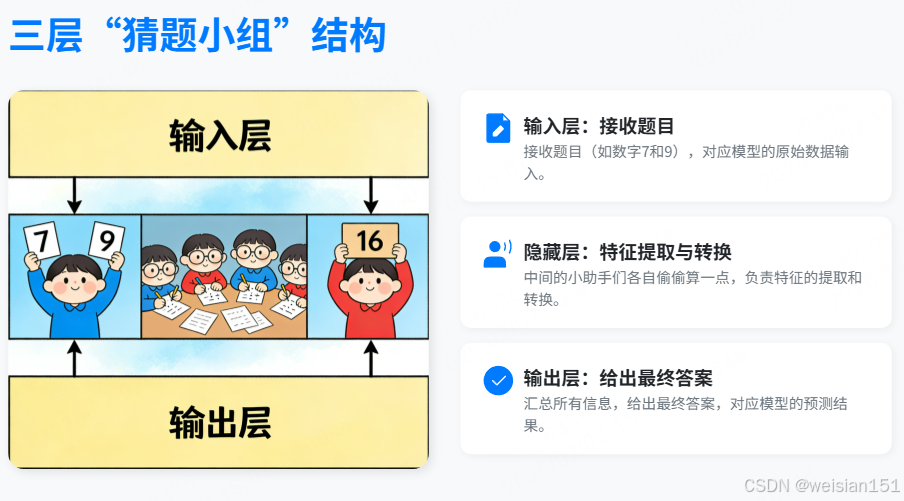 - 输出层:汇总所有信息,给出最终答案(比如"15")